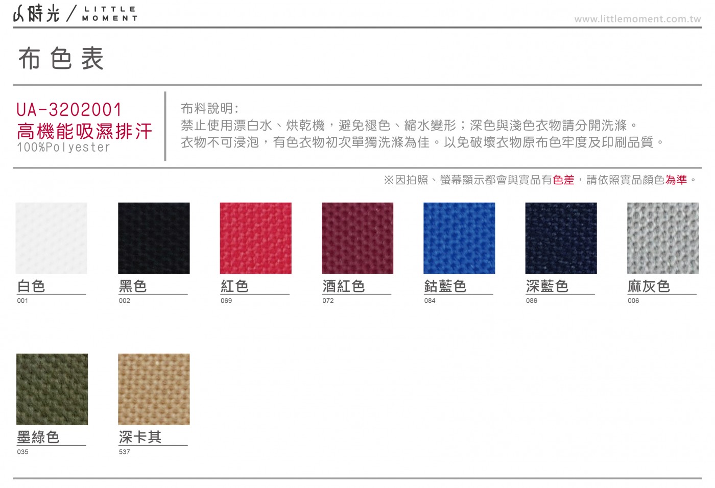 • 衣服會因不同時期染布,有顏色誤差值約10%左右,此為正常現象。