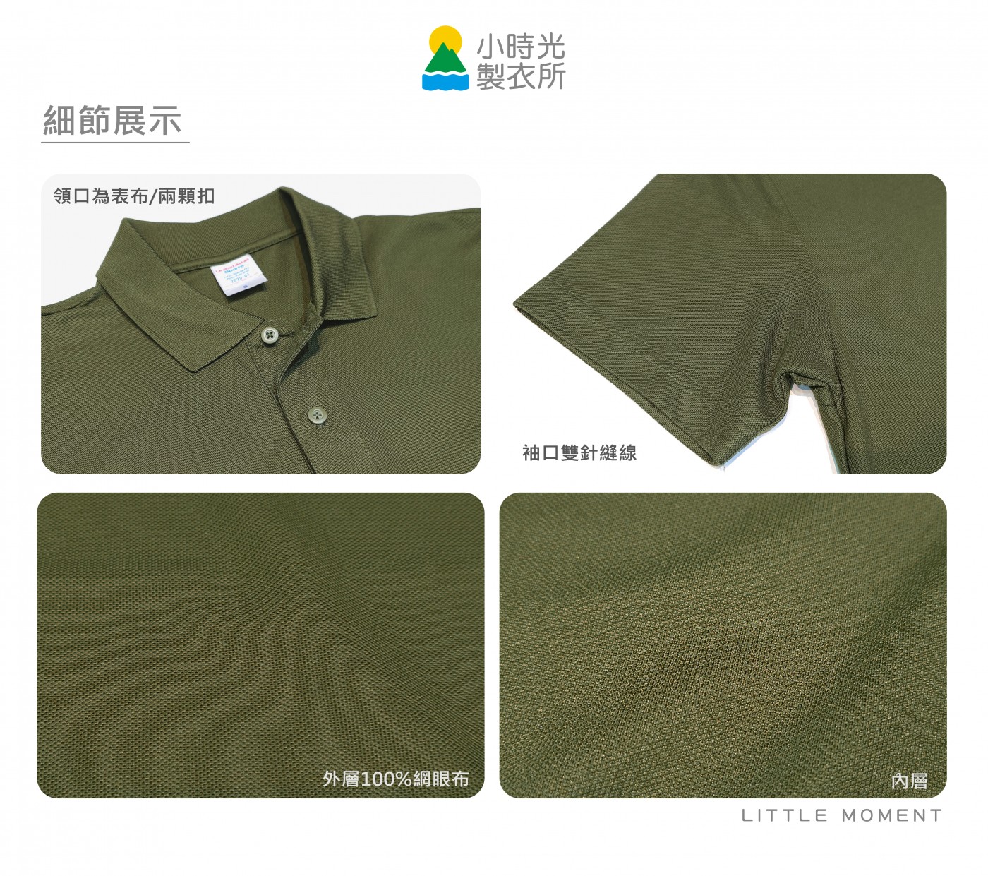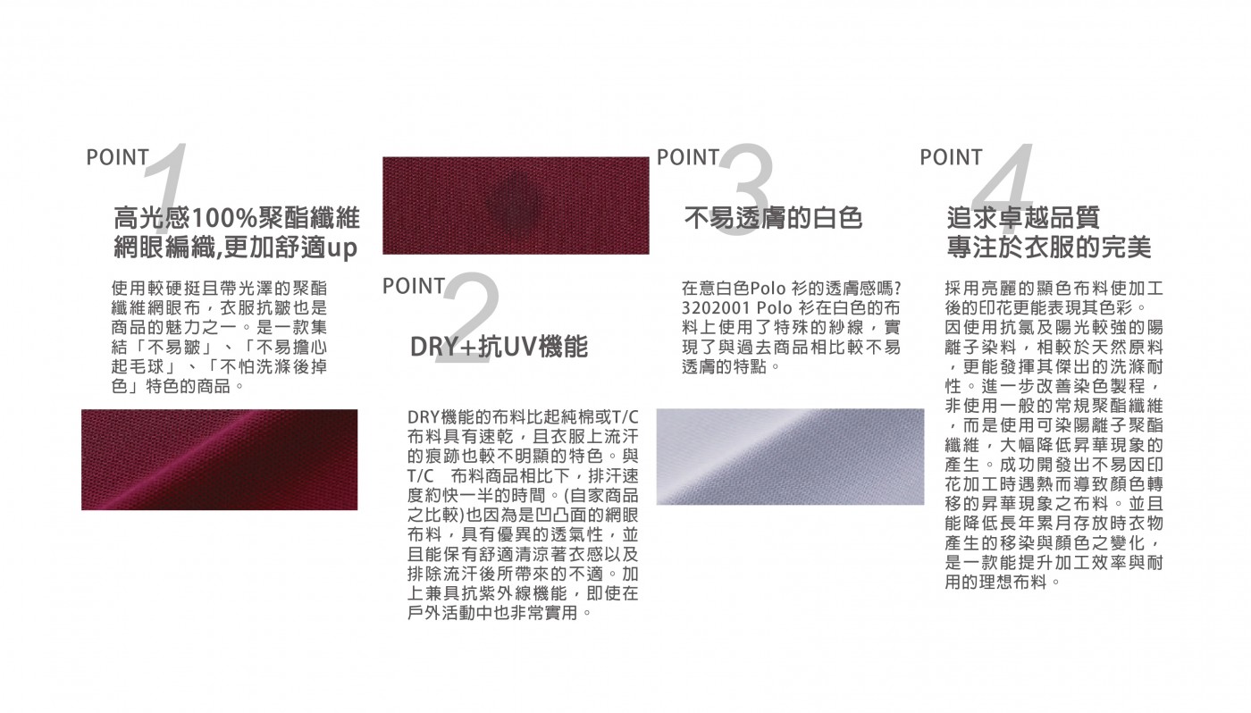 使用較硬挺且帶光澤感聚酯纖維網眼布,不易皺、快乾、多次洗滌也不易掉色!