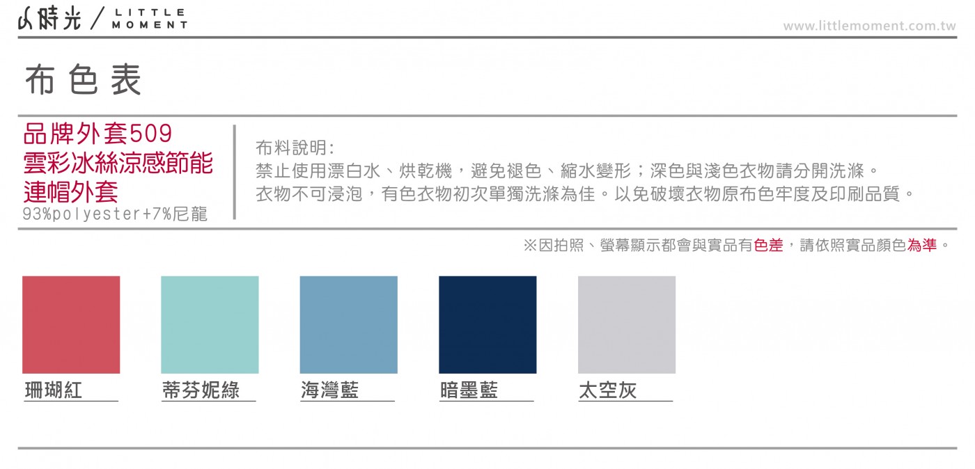 • 衣服會因不同時期染布,有顏色誤差值約10%左右,此為正常現象。