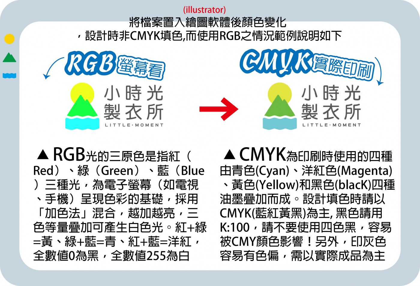 A: 因螢幕顯示器關係,以RGB(紅綠藍)色光成像,印刷是以CMYK(藍紅黃黑)印刷四色模式,